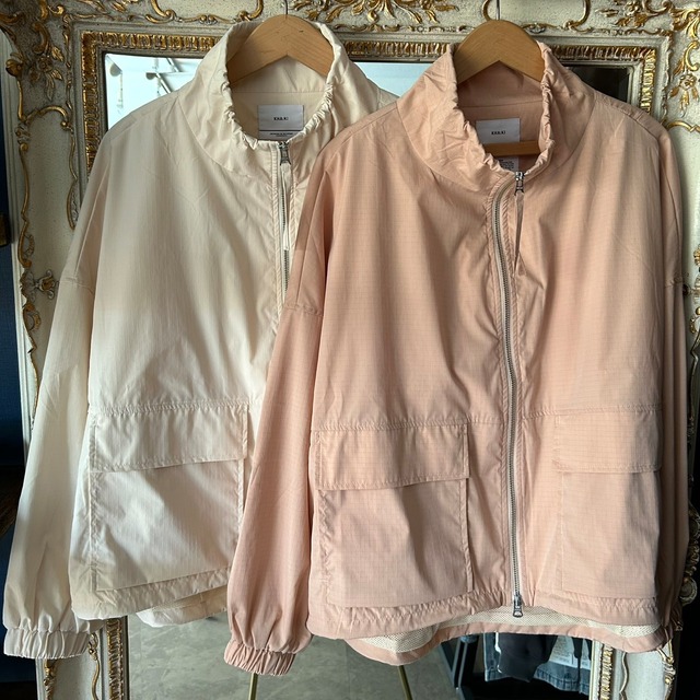 オリーブ、キャメルなどミリタリーウェアの色全般をさす言葉としてちょっと変わった色「khaki」。 ミリタリーウェアの様ないつまでも枯れない普遍性。 ずっと長く着続けて欲しいという思いがKHA:KIというブランドに込められています。 2025年春夏より展開し人気定番となったワイウドスクエアーなシルエットが特徴的なスタンドカラージップアップジャケット。 新色にライトカッパーが加わりました。 ポケットは2方向から手を入れることが出来ます。 衿と裾はドロスト仕様でシルエットのアレンジが可能。 裏地にメッシュを使用することでサラッとした肌触りを保ちインアートの干渉を抑えてくれます。 カラー: Lt.ベージュ Lt.カッパー(淡いオレンジとピンクが混ざった様なカラー) サイズ:1 表地:ポリエステル 100%