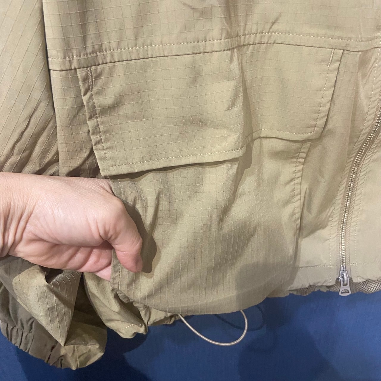 袖口はシャーリング仕様で袖をまくりやすいデザインで、衿と裾はドローコード仕様でシルエットのアレンジが可能です。
