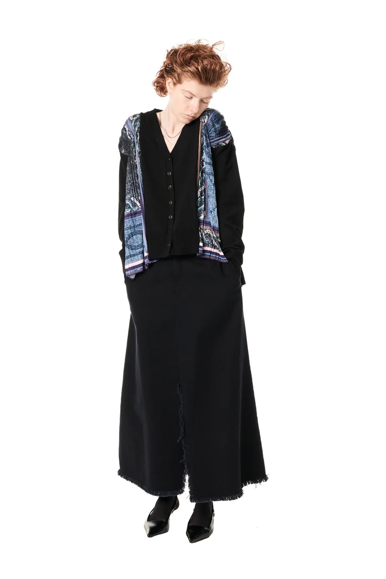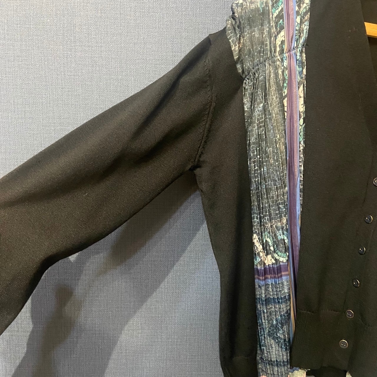 コットンポリのニットカーディガンにプリント生地のプリーツを合わせた非常に手の込んだニット。