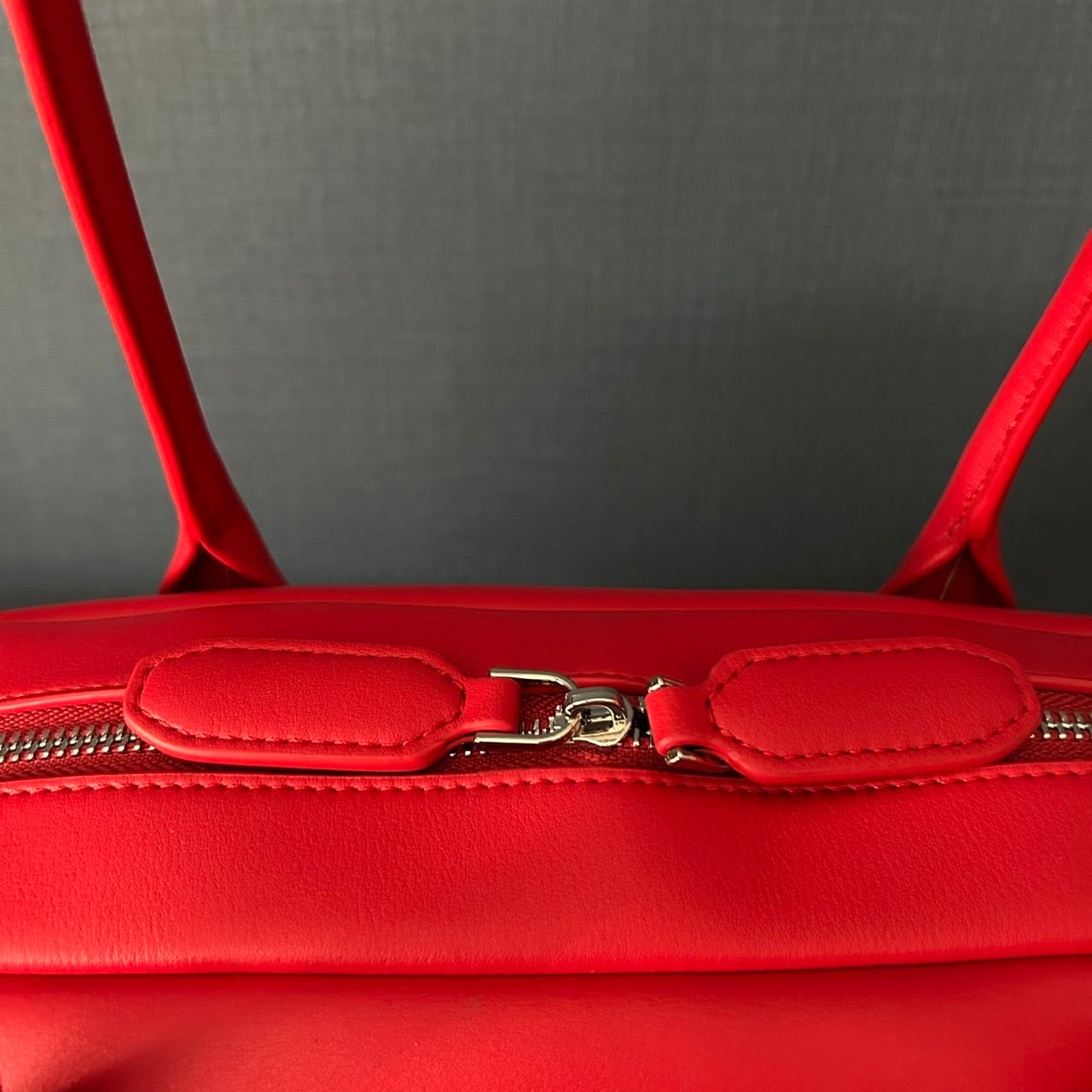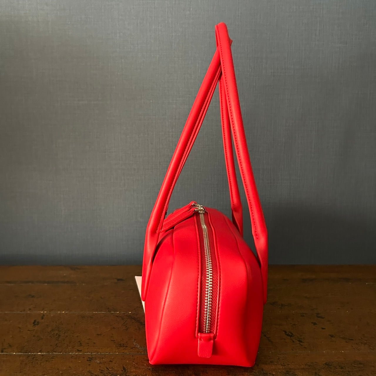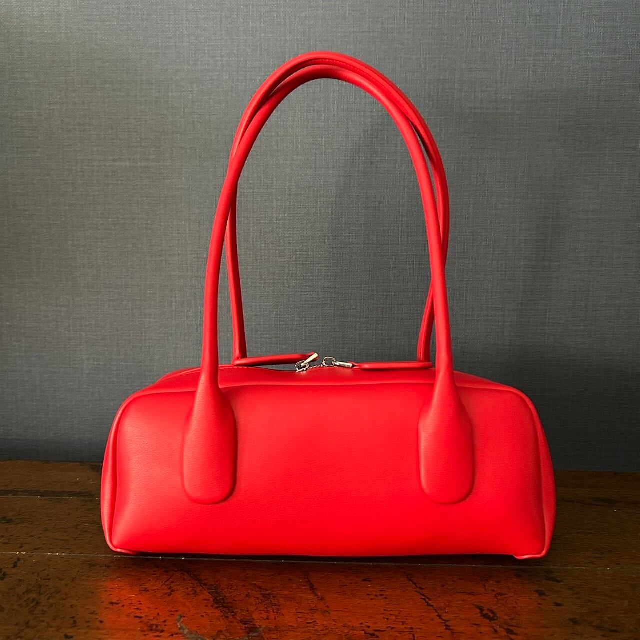 細長いバゲット型の本体に長めの持ち手の肩にかけた時の収まりが良いシンプルながら存在感のあるレザーバッグです。